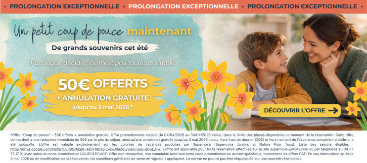 Offre “Coup de pouce” – 50€ offerts + annulation gratuite. Offre promotionnelle valable du 04/04/2026 au 30/04/2026 inclus, dans la limite des places disponibles au moment de la réservation. Cette offre donne droit à une réduction immédiate de 50€ sur le prix du séjour, ainsi qu’à une annulation gratuite jusqu’au 3 mai 2026 inclus, hors frais de dossier (20€) et hors montant de l’assurance annulation si celle-ci a été souscrite. L’offre est valable exclusivement sur les colonies de vacances produites par Supernova (Supernova Juniors et Nature Pour Tous). Liste des séjours éligibles : voir la liste des séjours éligibles. L’offre est applicable pour toute réservation effectuée sur le site supernova-juniors.com ou par téléphone au 04 77 73 17 31 avec saisie du code promotionnel COUPDEPOUCE. Offre non rétroactive, non cumulable avec tout autre code promotionnel ou accord spécifique, notamment les offres CSE. En cas d’annulation après le 3 mai 2026 ou de modification de la réservation, les conditions générales de vente en vigueur s’appliquent. La remise ne pourra être réappliquée sur une nouvelle réservation.